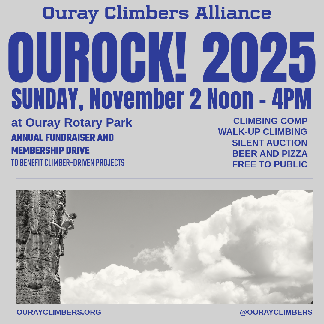 Rotary Park OurayJoin us for our annual community event on Sunday, November 2 at Rotary Park from noon till 5PM. This year’s event will feature: Walk-up guided climbing wall for adults and children (gear included) Live DJ Music with DJ Straylight Climbing Competition (open to all ages) Silent Auction Raffle Fresh baked pizza* Beer (must be 21 […]